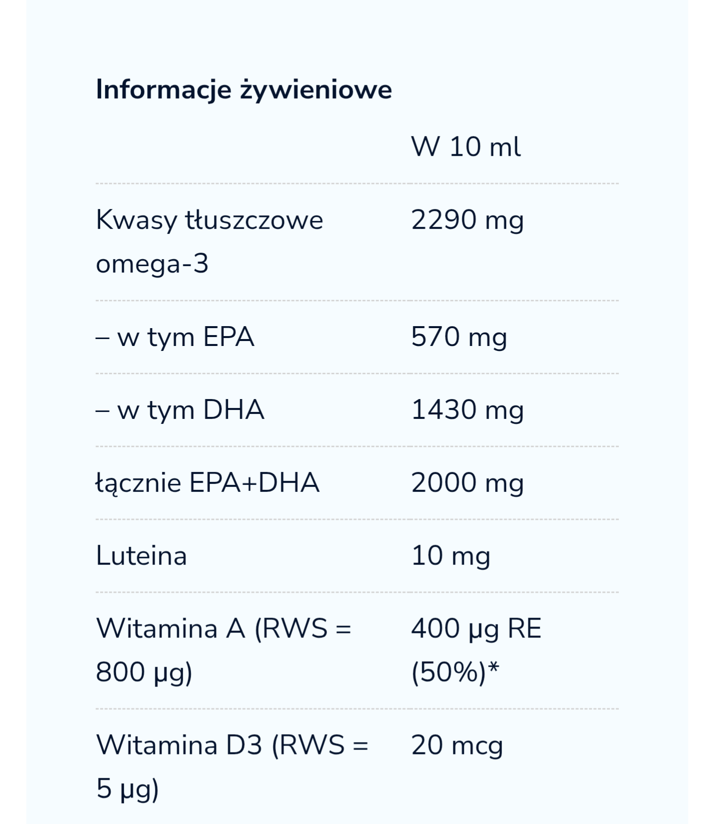 Zalecana porcja: 0,15 ml na 1 kg masy ciała. W 10 ml oleju Omega-3 Eqology Gold znajdziesz 2000 mg kwasów DHA i EPA. Pojemność butelki Omegi 300 ml