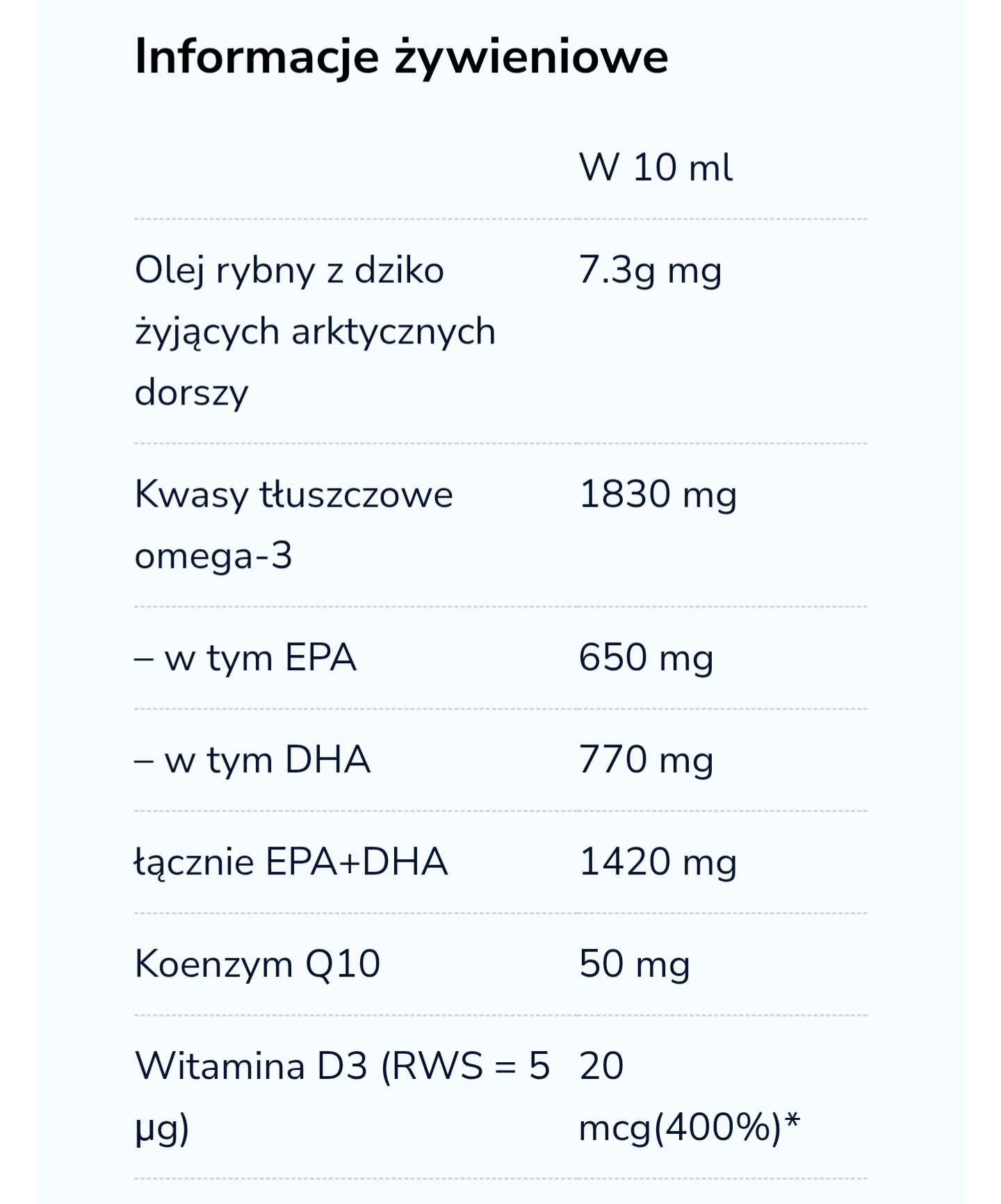 Dawka 10 ml dostarcza 1420 mg EPA i DHA oraz 50 mg ubichinolu, które współdziałają na poziomie komórkowym, aby dodać organizmowi energii i chronić serce.