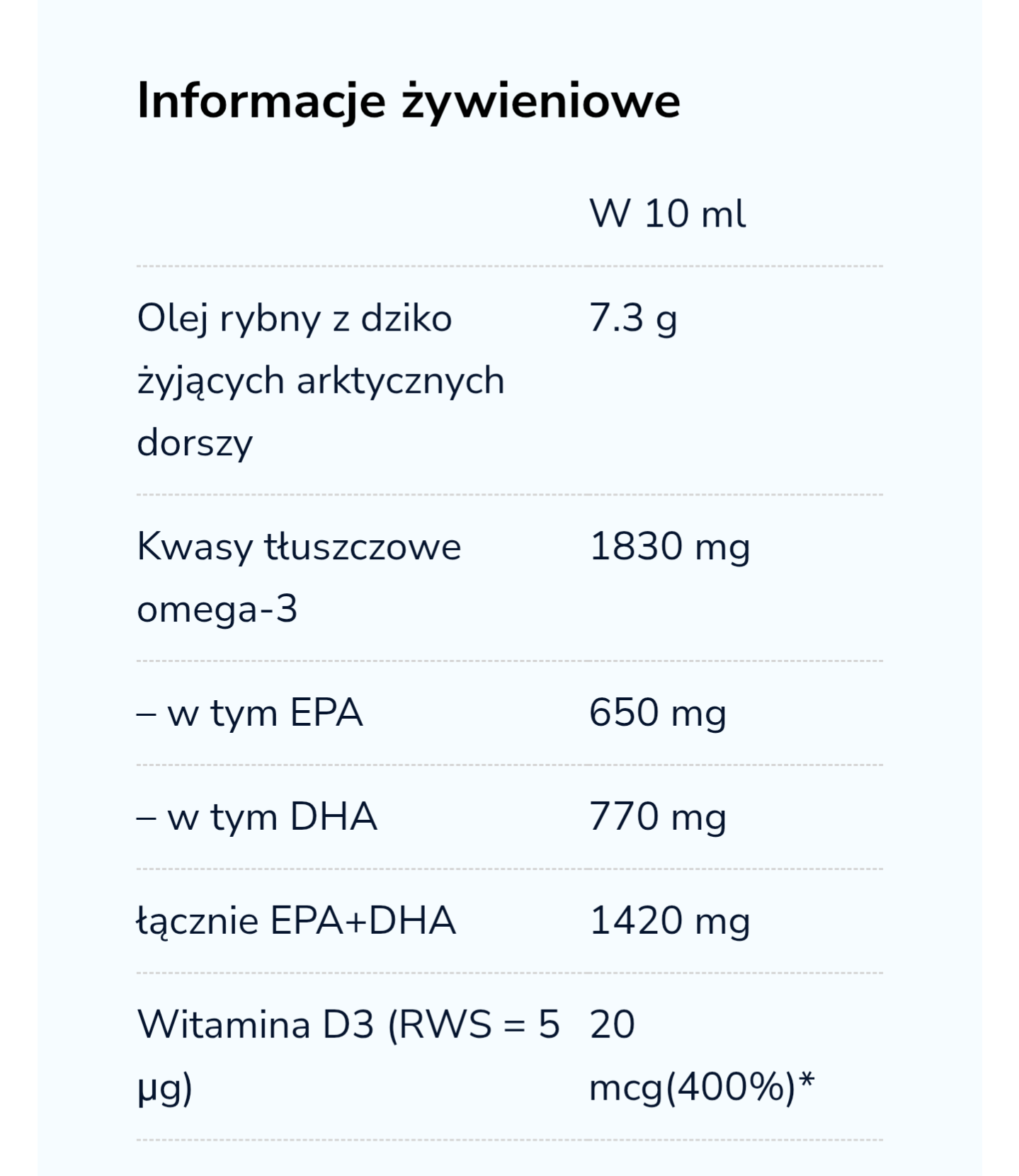 Zalecana porcja: 0,15 ml na 1 kg masy ciała. W 10 ml oleju Omega-3 Eqology Classic znajdziesz 1420 mg kwasów DHA i EPA.
